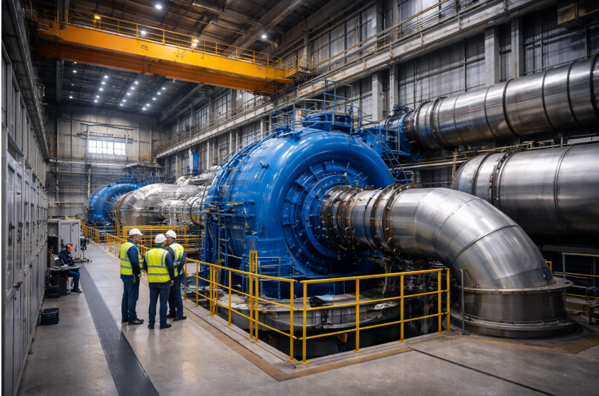Wasserkraftwerke nutzen die Energie von fließendem Wasser, um Turbinen anzutreiben, die einen Generator zur Stromerzeugung antreiben.